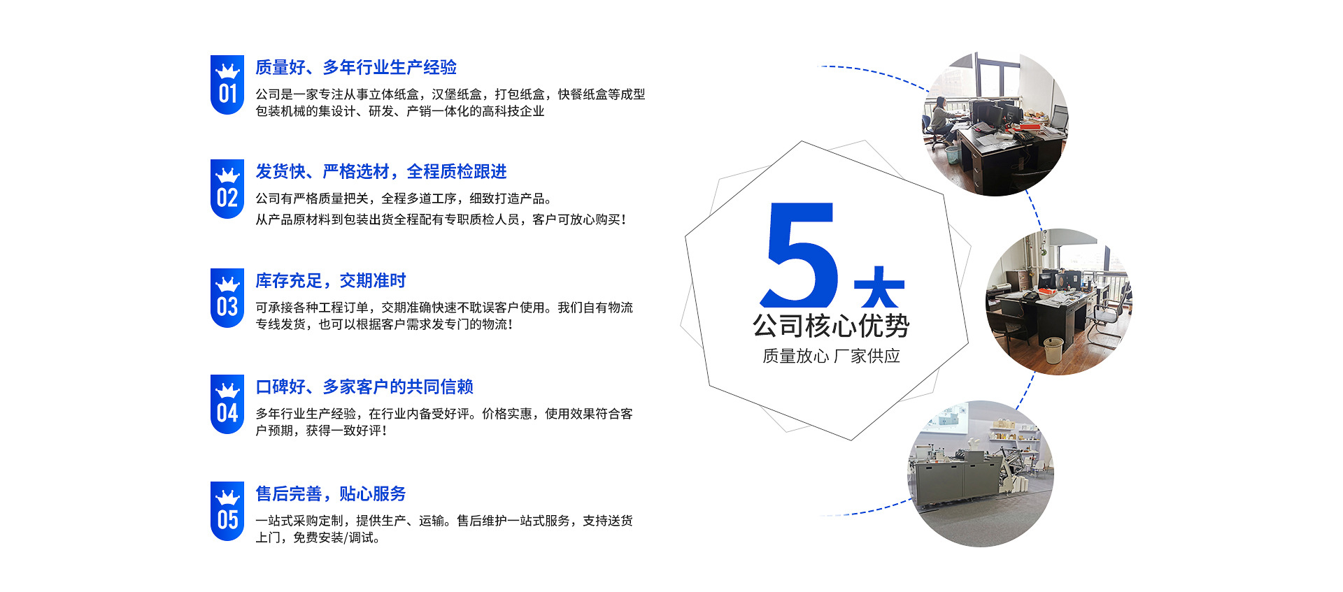 瑞安市中法機(jī)械有限公司是一家從事立體紙盒機(jī),漢堡紙盒機(jī),打包紙盒機(jī),快餐紙盒機(jī)等成型包裝機(jī)械的設(shè)計(jì)、研發(fā)、產(chǎn)銷一體化的高科技企業(yè)。公司有現(xiàn)代化的管理體系和完善的售后服務(wù)體系;有一支具有充滿青春活力的精銳研發(fā)團(tuán)隊(duì)!自成立以來,中法公司堅(jiān)守“誠信、學(xué)習(xí)、發(fā)展”的企業(yè)發(fā)展理念,堅(jiān)持“以誠信為道、以質(zhì)優(yōu)取勝”的經(jīng)營原則,在市場競爭中取得了良好的社會(huì)和經(jīng)濟(jì)效益!